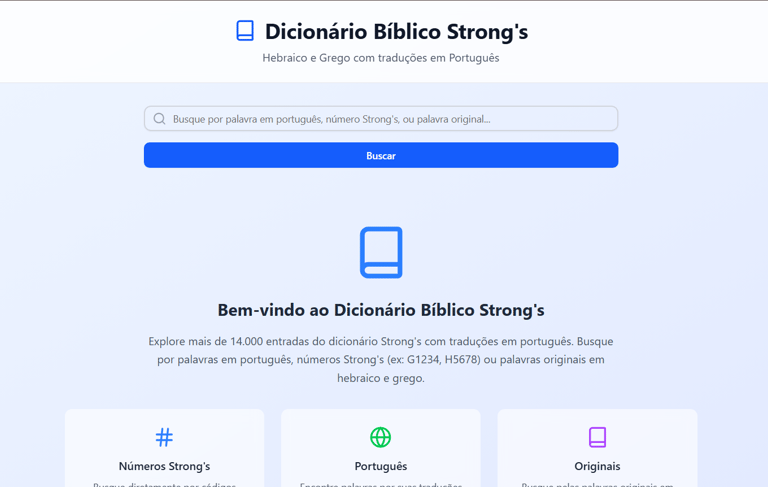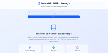 Explore mais de 14.000 entradas do dicionário Strong's com traduções em português. Busque por palavras em português, números Strong's (ex: G1234, H5678) ou palavras originais em hebraico e grego.
